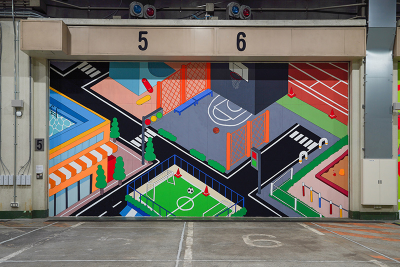 この作品は、眠らない街東京…ではなく普段働いてる建物や機械などが休日に眠ってる壁画です。天王洲は昼は忙しいビジネスの町ですが、休日になると観光客や家族連れが訪れる緩やかな雰囲気を持っています。そういう休日のリラックスしたムードを壁画として描き、湾岸エリアのおおらかさを表現できればと考えています。(一部継続作品)PROFILE