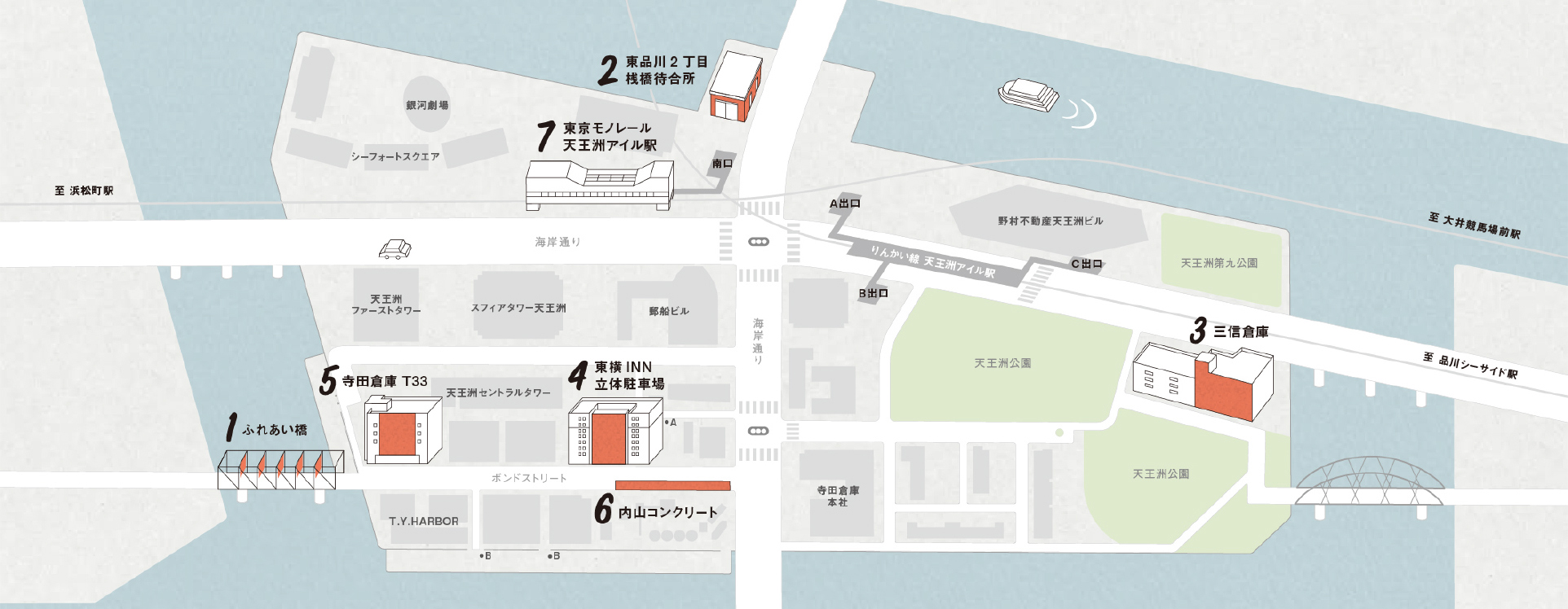 ふれあい橋橋梁 / 東横INN立体駐場壁面 / 三信倉庫壁面/寺田倉庫T33 壁面 / 東品川2丁目桟橋待合所壁面 / ボンドストリート(内山コンクリート) 壁面 /東京モノレール「天王洲アイル」駅改札前