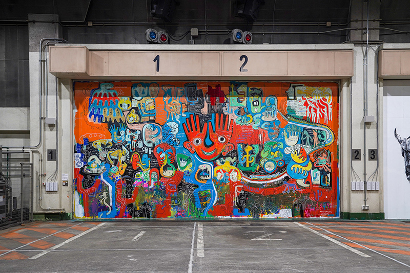 東京/ 天王洲の活気あるイメージをグラフィティを通して描いています。描かれているのは、天王洲の海辺や、道を行きかう人々の足、運河沿いに見えるビル群です。これらの絵は、実はグラフィティの文字になっていて、それらが重なり合い街の活気あり雑多なイメージを描きました。PROFILE